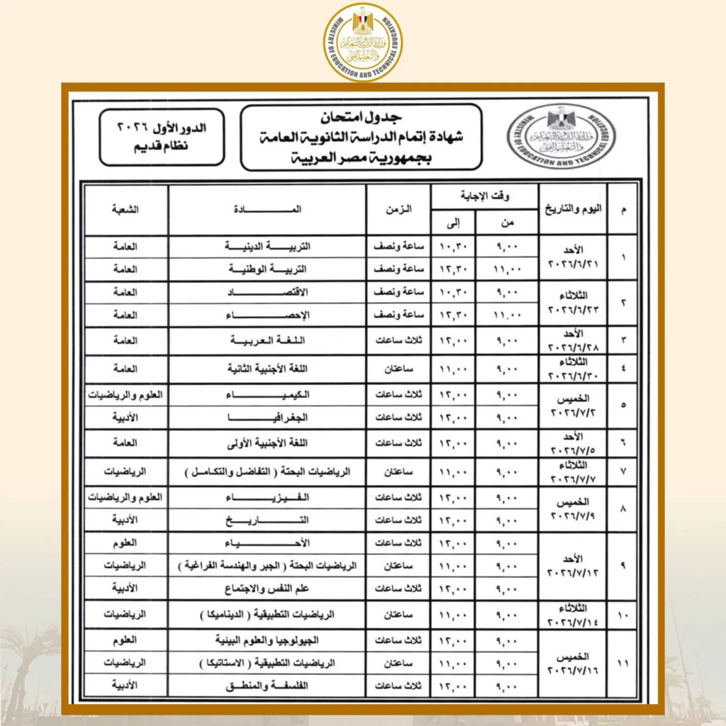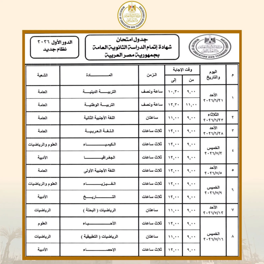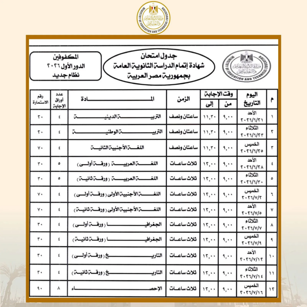 وبحسب الجداول المعتمدة، تبدأ امتحانات الثانوية العامة (النظامين الجديد والقديم) وامتحانات المكفوفين يوم الأحد الموافق 21 يونيو 2026، وتستمر حتى يوم الخميس 16 يوليو 2026.