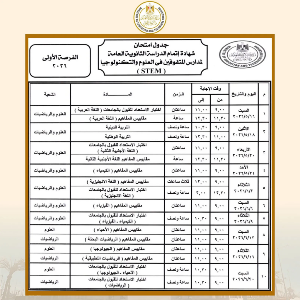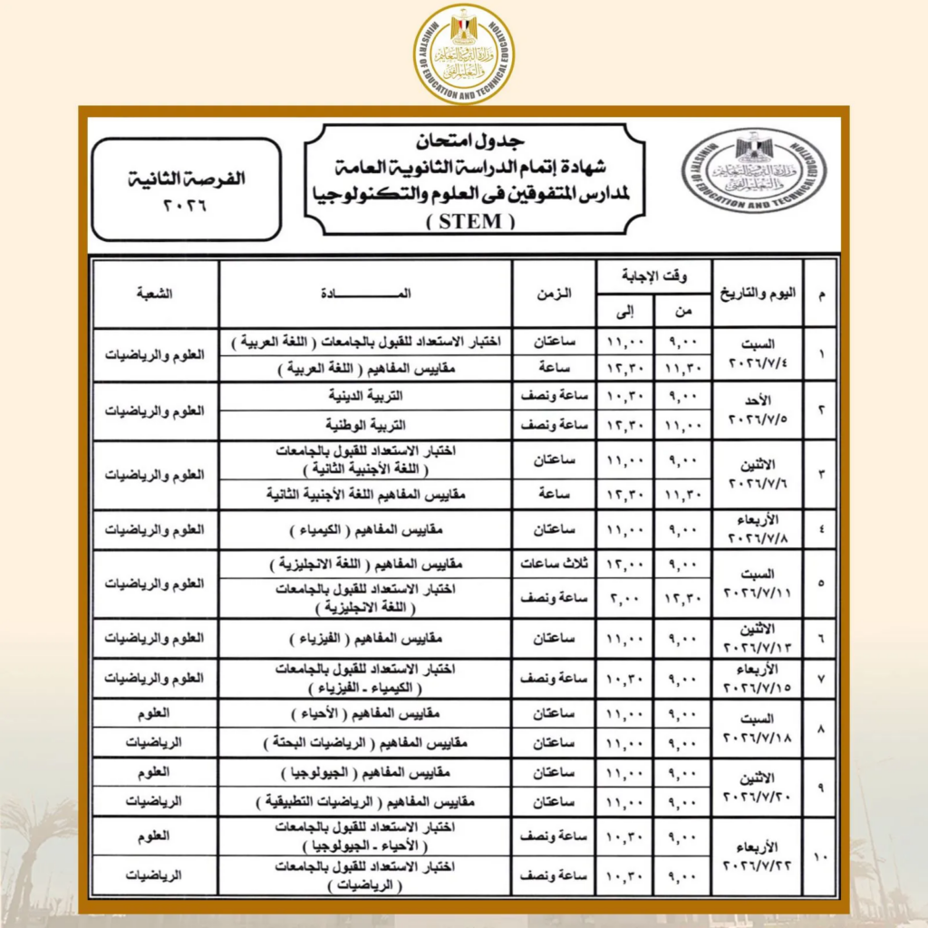 كما تبدأ امتحانات شهادة إتمام الثانوية العامة بمدارس المتفوقين STEM (الفرصة الأولى) يوم 16 مايو 2026، وتستمر حتى 20 يونيو 2026، على أن تبدأ امتحانات الفرصة الثانية يوم السبت 4 يوليو 2026، وتستمر حتى 22 يوليو 2026.