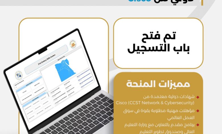 في إطار توجيهات القيادة السياسية بالاستثمار في رأس المال البشري وتعزيز جاهزية الشباب لسوق العمل، يعلن صندوق تطوير التعليم التابع لرئاسة مجلس الوزراء، بالتعاون مع وزارة التعليم العالي والبحث العلمي، ومن خلال مبادرة «كن مستعداً»، عن إتاحة 300 منحة تدريبية مجانية لطلاب الجامعات والخريجين، وذلك بالتعاون مع شركة سيسكو العالمية، بهدف تأهيلهم في مجالات التكنولوجيا الحديثة ومنحهم شهادات احترافية معترف بها دوليا