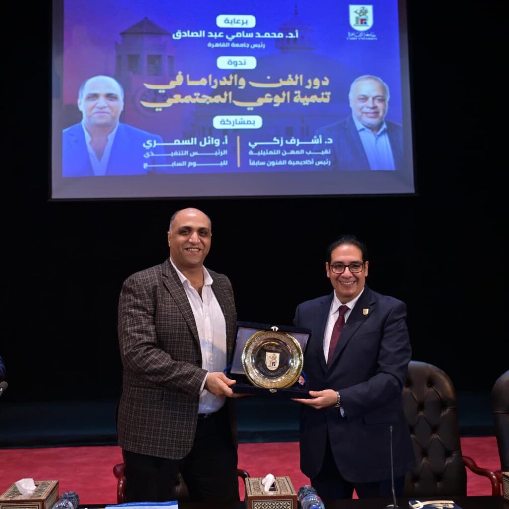 وكان الدكتور محمد سامي عبدالصادق، قد أهدى درع جامعة القاهرة لكل من الدكتور أشرف ذكي والاستاذ وائل السمري، تقديرًا لدورهما في إثراء وعي طلاب الجامعة، وتعزيز إدراكهم لدور الفن والدراما في تنمية الوعي المجتمعي.