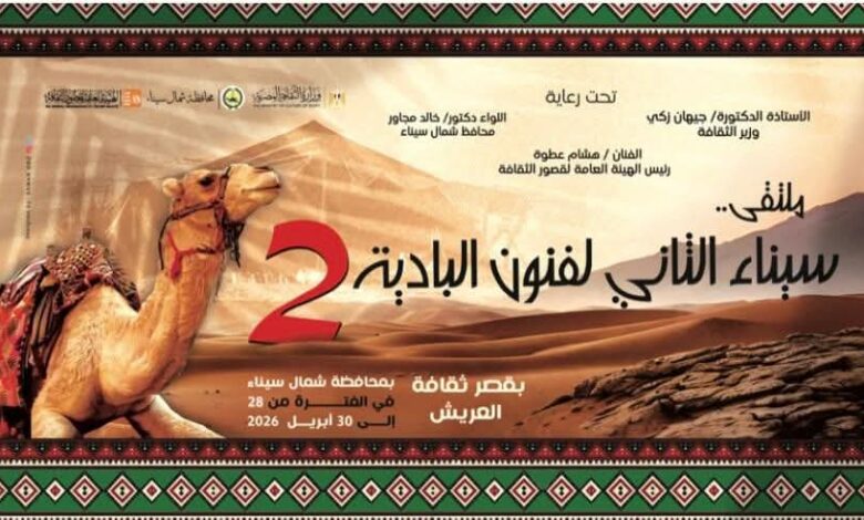 تنطلق في الثامنة مساء بعد غد الثلاثاء بقصر ثقافة العريش بمحافظة شمال سيناء عاصمة الثقافة المصرية، فعاليات ملتقى “سيناء الثاني لفنون البادية”، تحت رعاية الدكتورة جيهان زكي وزيرة الثقافة، واللواء خالد مجاور محافظ شمال سيناء، وتنظمه الهيئة العامة لقصور الثقافة برئاسة الفنان هشام عطوة، ضمن برامج احتفالات وزارة الثقافة بالذكرى الرابعة والأربعين لتحرير سيناء.