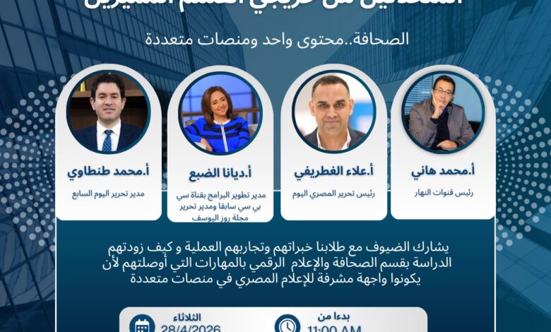 ويشمل برنامج اليوم أيضًا تكريم الطلبة المتميزين، وعرض نماذج من المشروعات الصحفية المتميزة التي أنجزها طلبة القسم، في إطار دعم الإبداع وتعزيز الجانب التطبيقي.