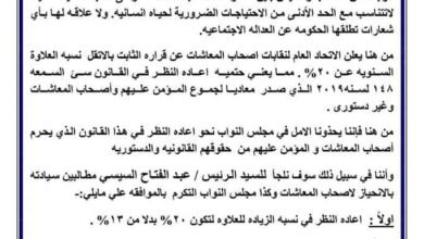 اصدر اتحاد اصحاب المعاشات بيانا منذ قليل يطالب فيه بعلاوة 20% ورفع الحد الأدني للمعاش الي 2400 جنيه واعادة الحوار…